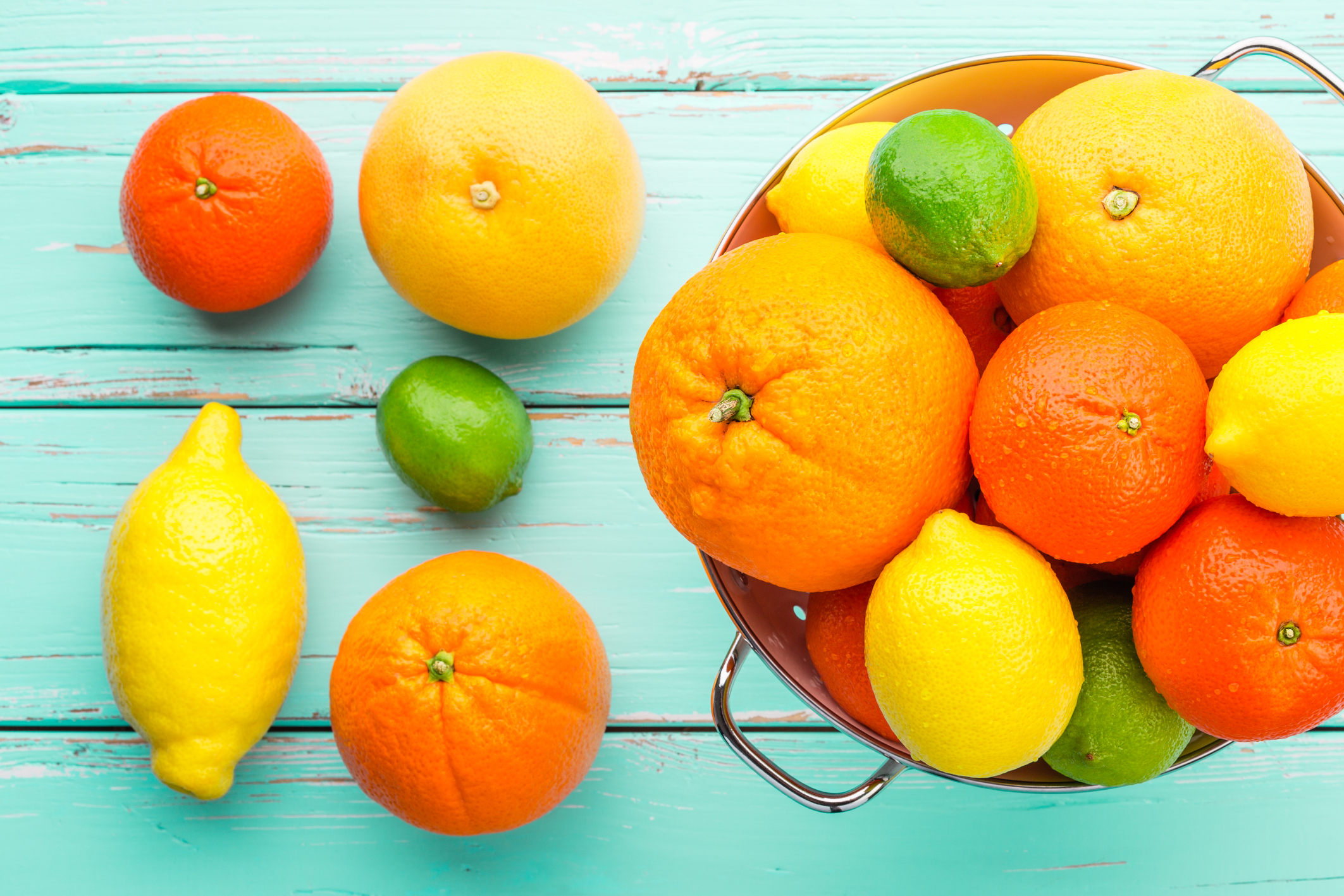 Citrus fruits in retro colander.