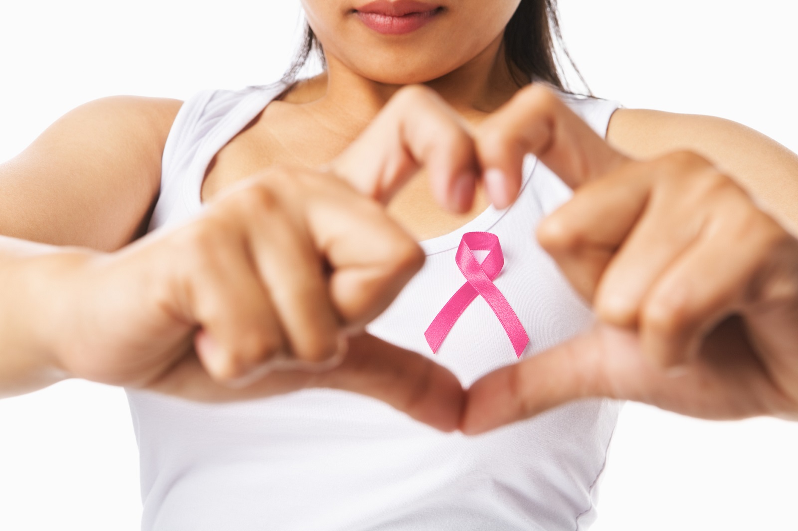 Heart framing from fingers on woman chest with pink badge to support breast cancer cause, PS: you can change the ribbon color to red to support AIDS cause as both using same symbol