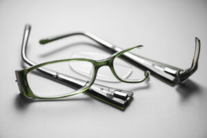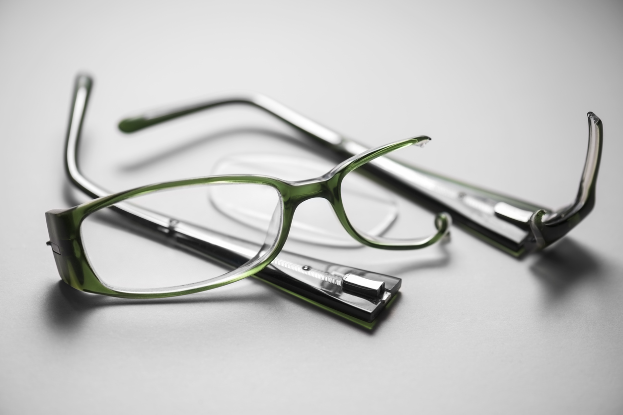 This is an overhead image of a pair of plastic spectacles lying broken on a white background. Both arms of the green glasses have snapped off, one lens has fallen out and is lying beside the frames. The glasses cast strong shadows onto the plain white background underneath them.