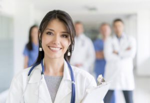 Happy female doctor at the hospital with medical staff at the background looking at the camera and smiling – healthcare and medicine