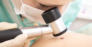 Dermatologist examines patient birthmark with dermatoscope