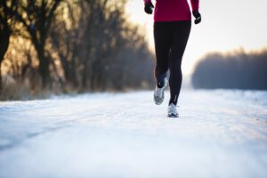 Young woman running outdoors on a cold winter day