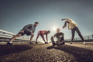 Low angle view of young people warming up before sports training and stretching on a road.