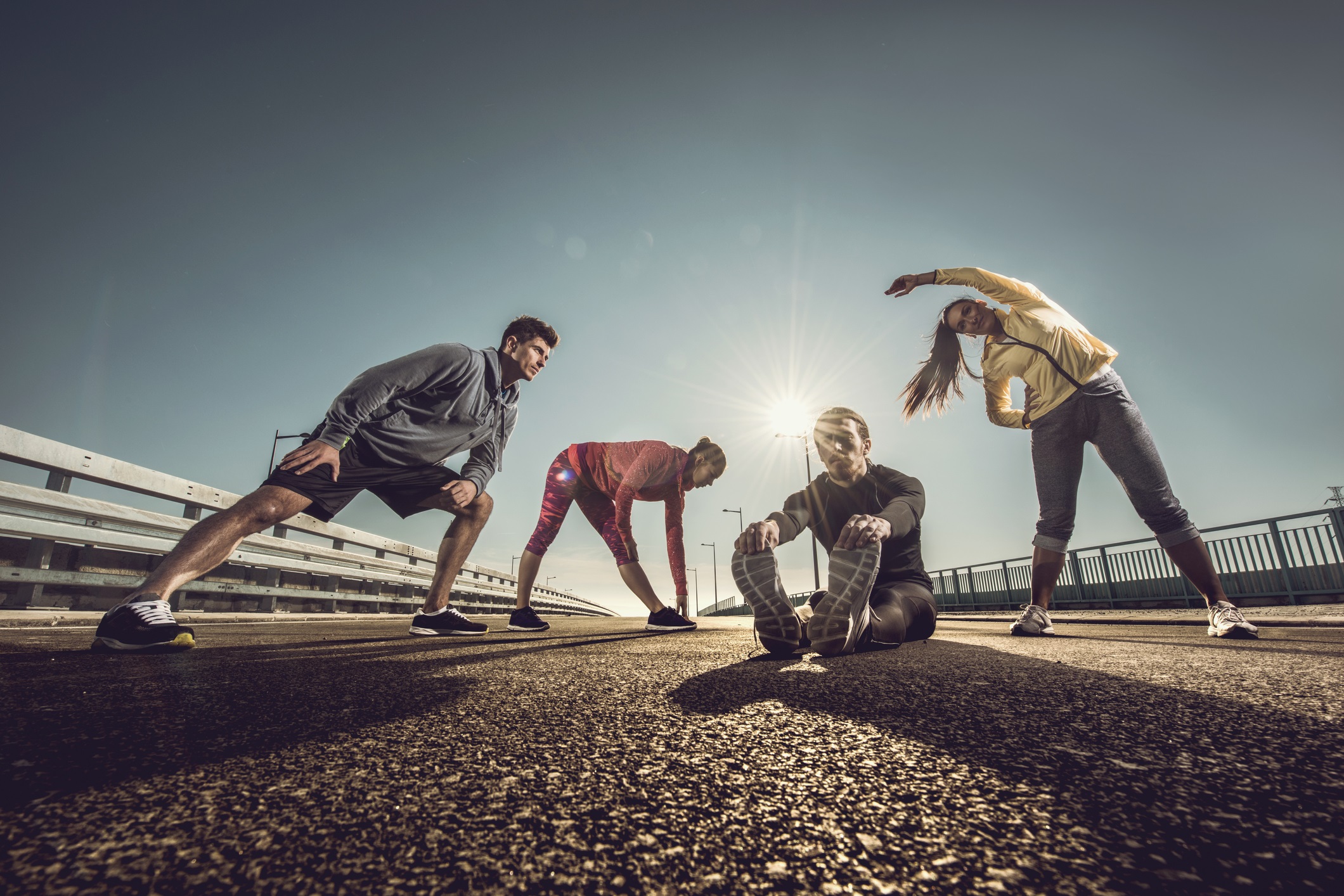 Below view of young athletes doing stretching exercises on road.
