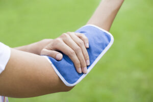 woman putting an ice pack on her arm pain