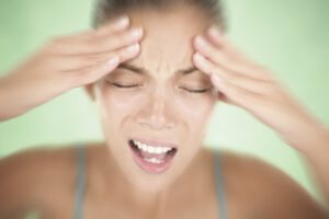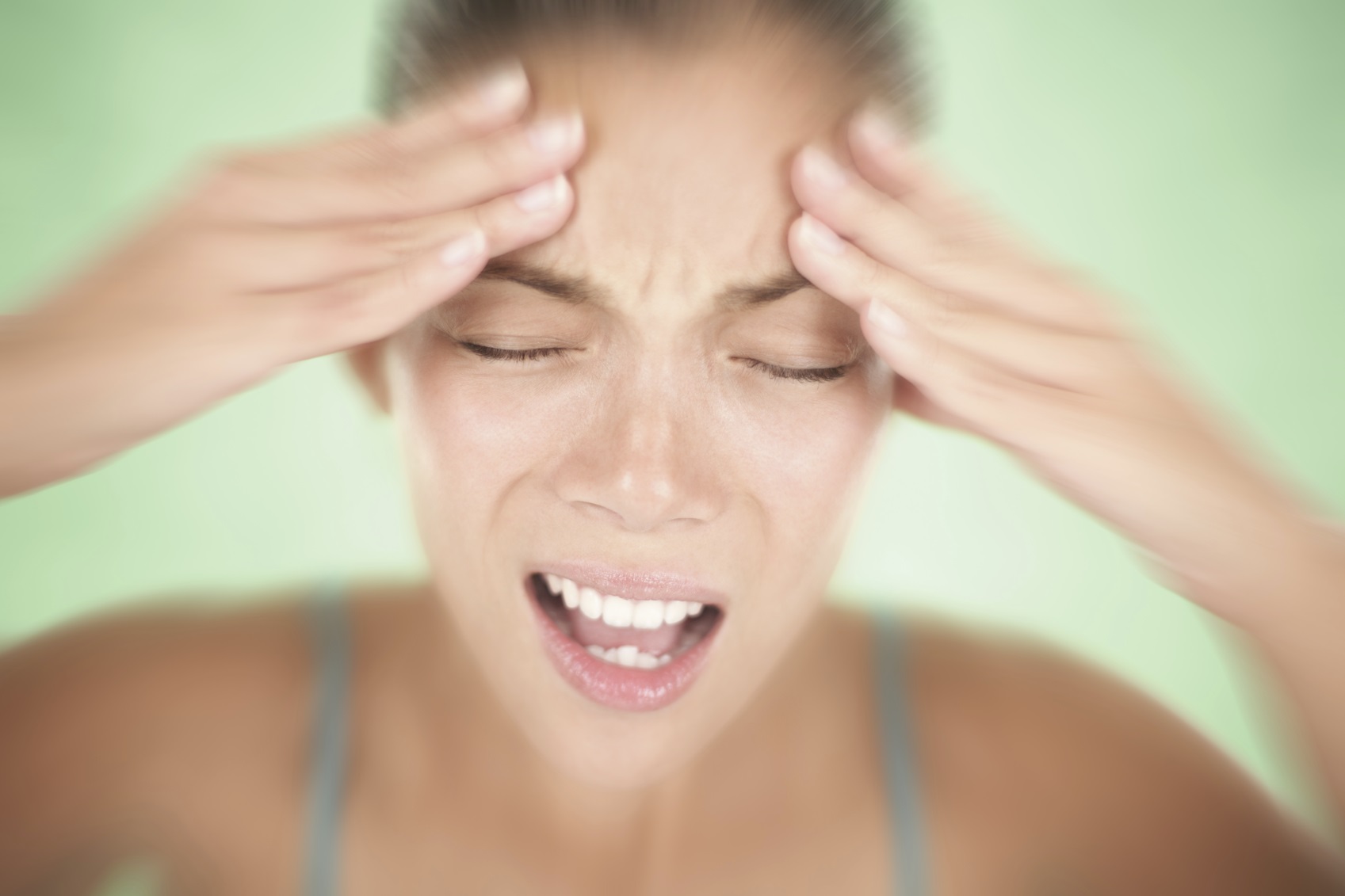 Woman having a headache holding her forehead in pain. Shallow depth of field on a green background. See more!